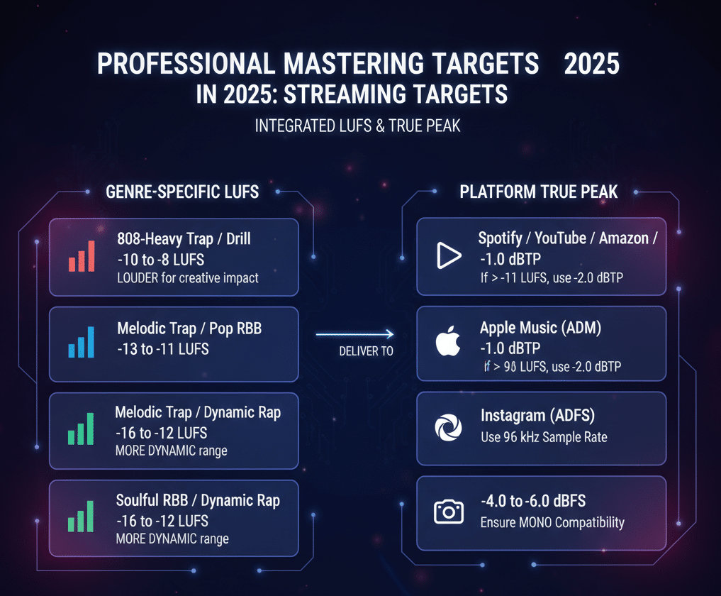 Mastering in 2025 is a balancing act between achieving competitive loudness and preserving the dynamics that give a track life and punch. The so-called “loudness wars” have effectively ended on major streaming platforms, which now use loudness normalization to ensure a consistent listening experience.11 This shift requires engineers to focus on specific metrics, but these should be treated as targets, not immutable rules. Achieving a balanced overall sound is essential for a professional result, as it enhances the final listening experience and ensures the track stands out across different platforms. For rap mastering, aiming for an integrated loudness level of -8 to -10 LUFS ensures the track remains impactful while adhering to modern loudness standards. These targets are especially relevant when mastering a rap song to achieve a competitive sound. The table below provides an excellent starting point for mastering rap, trap, and R&B tracks in 2025. The final arbiter is always how the master sounds.