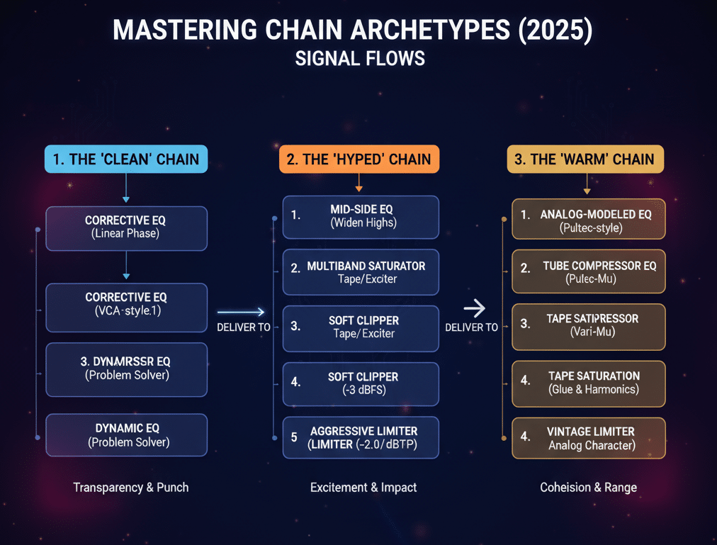 The sequence and type of processors used in a mastering chain define its sonic character. While every track is unique, most professional mastering workflows can be categorized into a few core philosophies or “archetypes.” An experienced engineer can select and adapt the right mastering chain for each track, ensuring optimal results. The order of operations is deliberate; each stage prepares the audio for the next, and different combinations are used to achieve distinct results. In particular, the ‘Warm’ chain often incorporates analog equipment or analog-modeled plugins to impart classic warmth and character to the final sound.