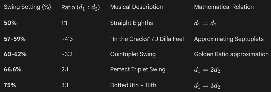 Historically, the Akai MPC sampler series (specifically the MPC60 and MPC3000) codified this parameter, establishing a standard that largely defines modern hip-hop and electronic dance music (EDM). The “MPC Swing” settings provide a discrete set of ratios that have become culturally embedded standards.