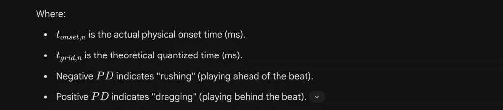 To quantify this, researchers measure the Phase Difference (PD) of onsets relative to a metronomic grid. For a sequence of N events, the deviation of the n-th event is: