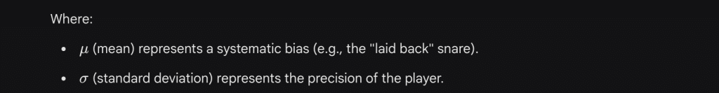 When digital audio workstations (DAWs) attempt to simulate “human feel” via a “Humanize” function, they typically employ a Gaussian (Normal) distribution to generate random timing offsets.