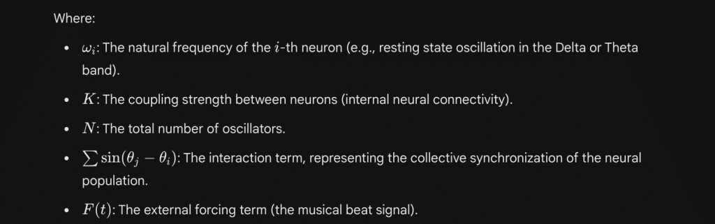 To model the interaction between a musical rhythm and the human brain, we utilize the Kuramoto Model, a canonical mathematical framework for describing the synchronization of coupled oscillators.In this context, we model neural populations (e.g., in the auditory cortex and motor planning areas) as oscillators with natural frequencies, and the musical beat as an external periodic forcing term.