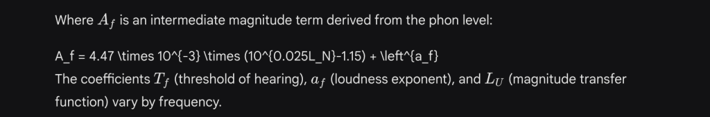 The standard calculation for the Phon level (LN) from SPL (Lp) at frequency f involves the following derivation: