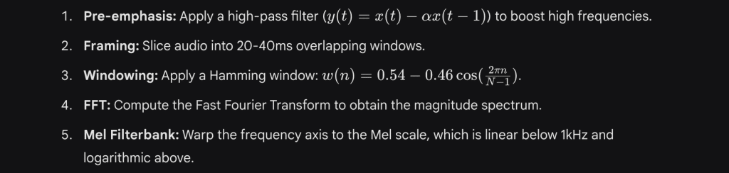 - Logarithm: Take the log of the filterbank energies (simulating decibel perception).
